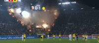 第46分钟,现场气氛热烈,球迷们燃放烟花庆祝