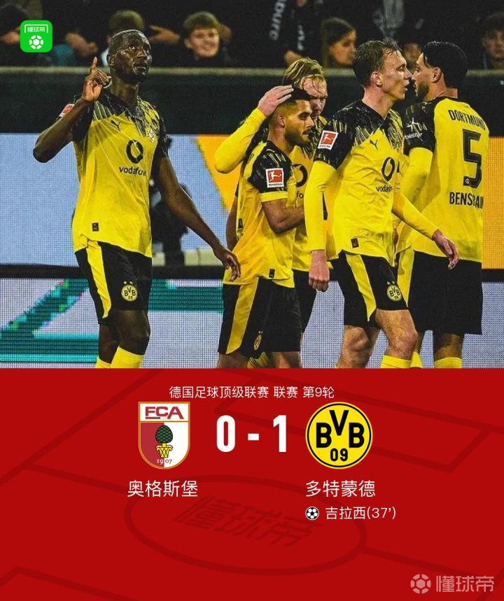 北京时间11月1日,德国足球甲级联赛第9轮赛事中,奥格斯堡队在主场迎战多特蒙德队。上半场阶段,吉拉西抓住机会推射破门,为比赛首开纪录。整场比赛中,两队合计只有2次射门命中目标。最终,全场比赛结束,多特蒙德队在客场以1-0的比分小胜奥格斯堡队,取得了各项赛事的四连胜。